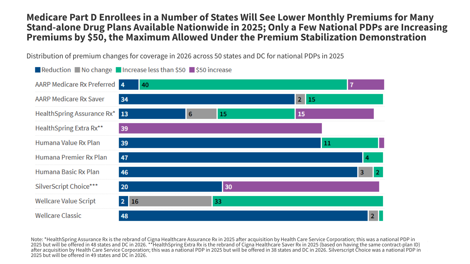 - Enrollees within the third hottest PDP, SilverScript Alternative, will face the utmost $50 enhance of their month-to-month premium in 30 states (together with DC), however a premium discount in 20 different states. The month-to-month premium will range throughout states and DC from $14.70 to $116.